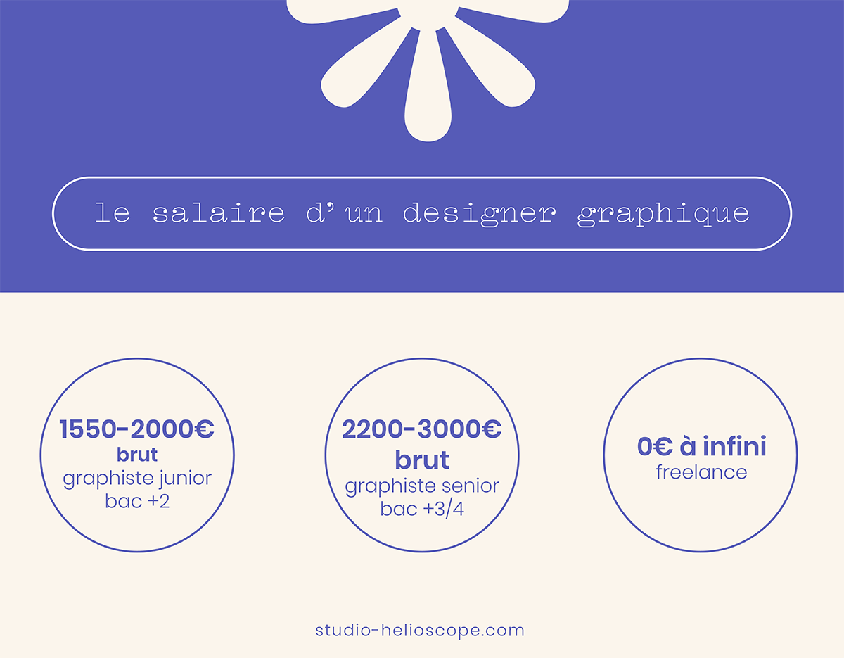 Comme vu plus haut, un designer graphique junior gagne en moyenne (j’insiste sur “en moyenne”) entre 1500€ et 2000€ brut par mois avec un bac+2 en poche.