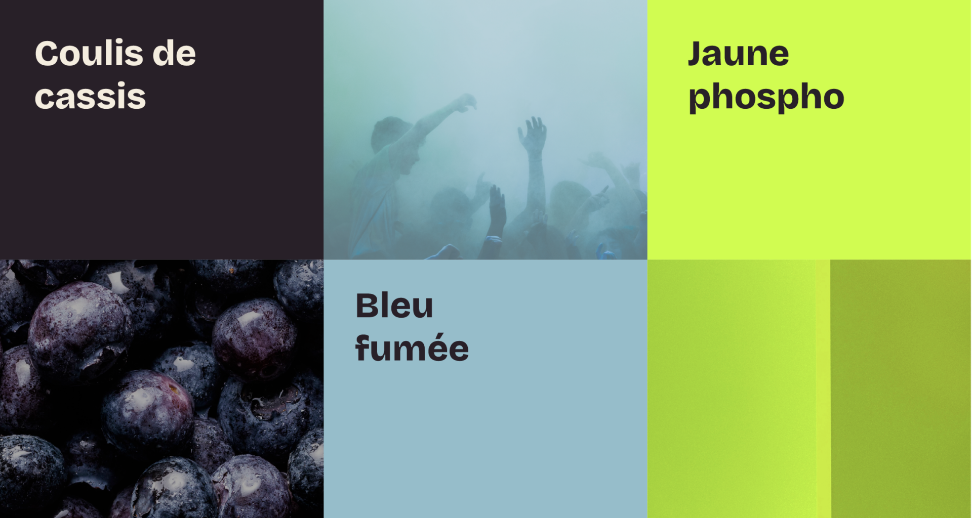 J’ai choisi des couleurs symboliques : un cassis profond, en hommage à la Bourgogne, un bleu pâle rappelant la fumée flottante lors des concerts, et un jaune phosphorescent pour apporter une touche sonore visuelle.