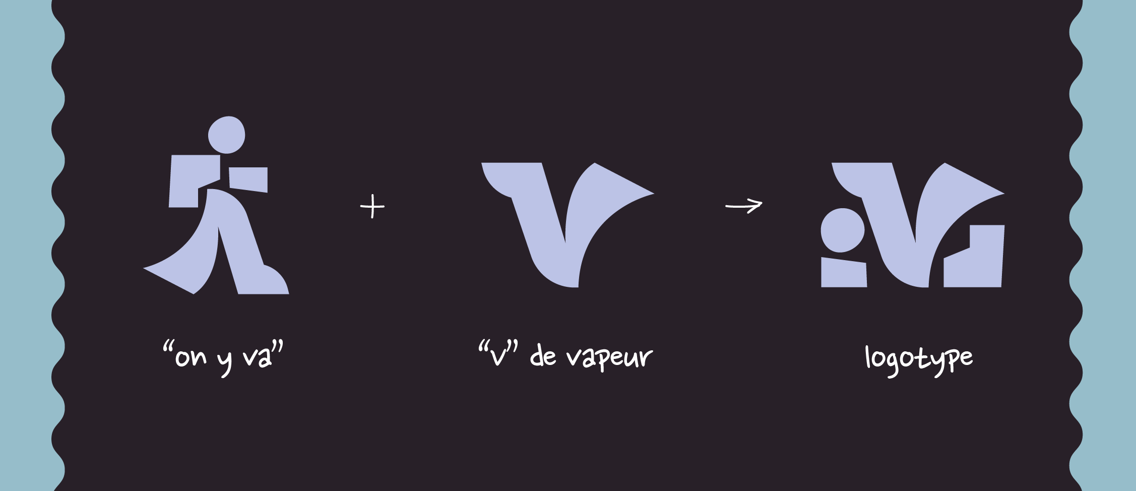 Le « V » central et les éléments du logo forment un personnage inspiré du symbole « exit ». Ce design symbolise le mouvement constant qui anime La Vapeur et invite à l’exploration musicale.